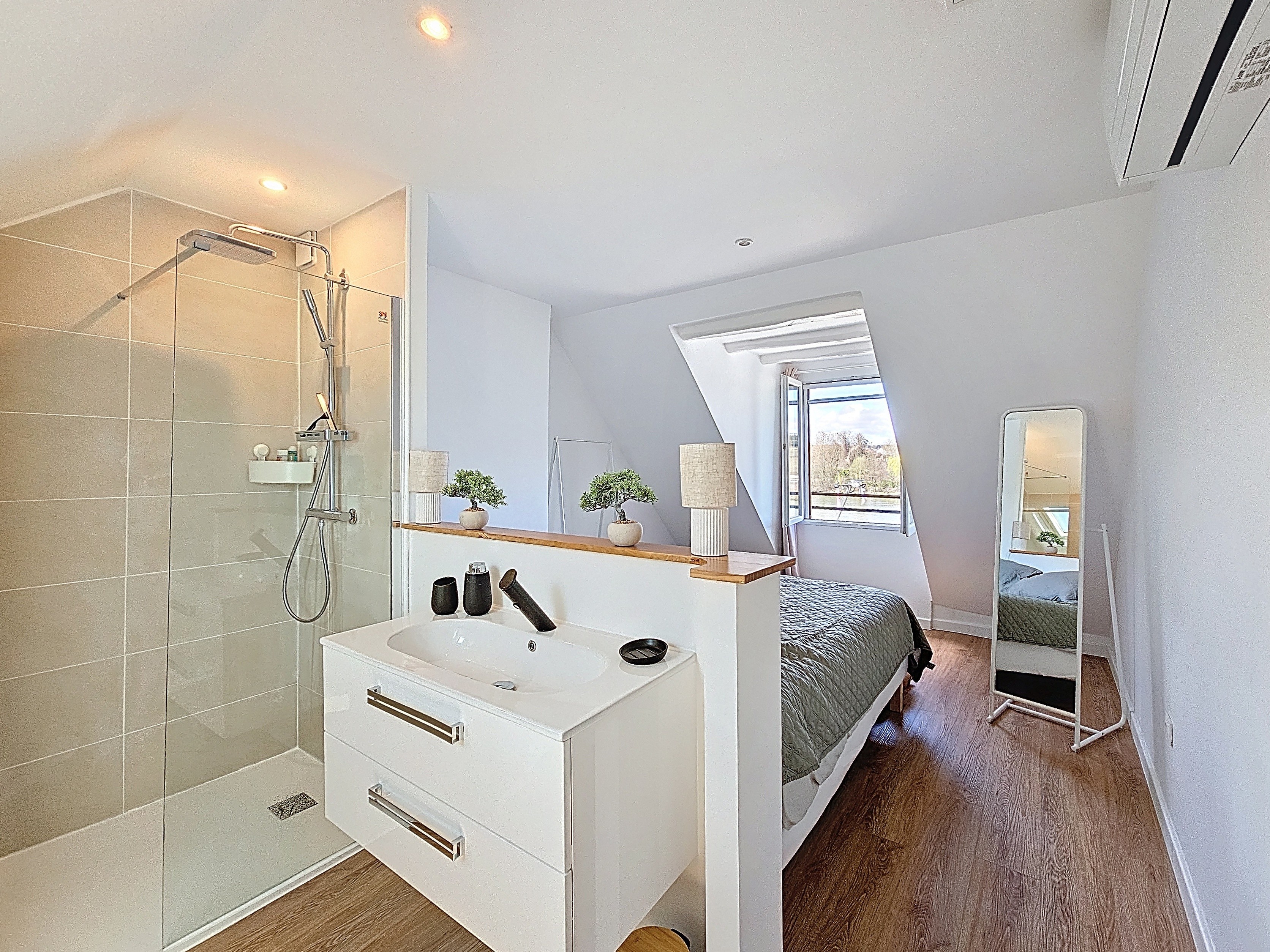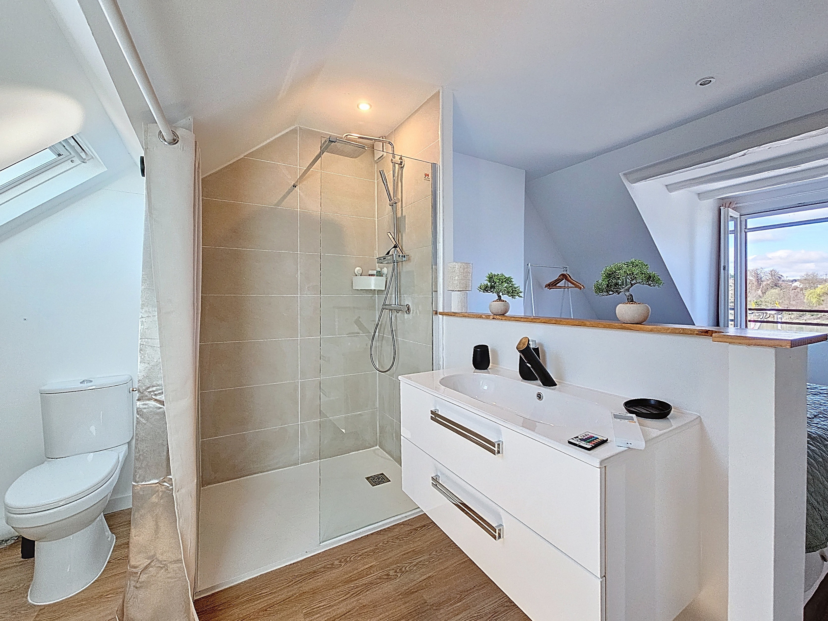 🚿 Salle de bain ouverte dans la chambre, comprend une douche, un lavabo et des toilettes