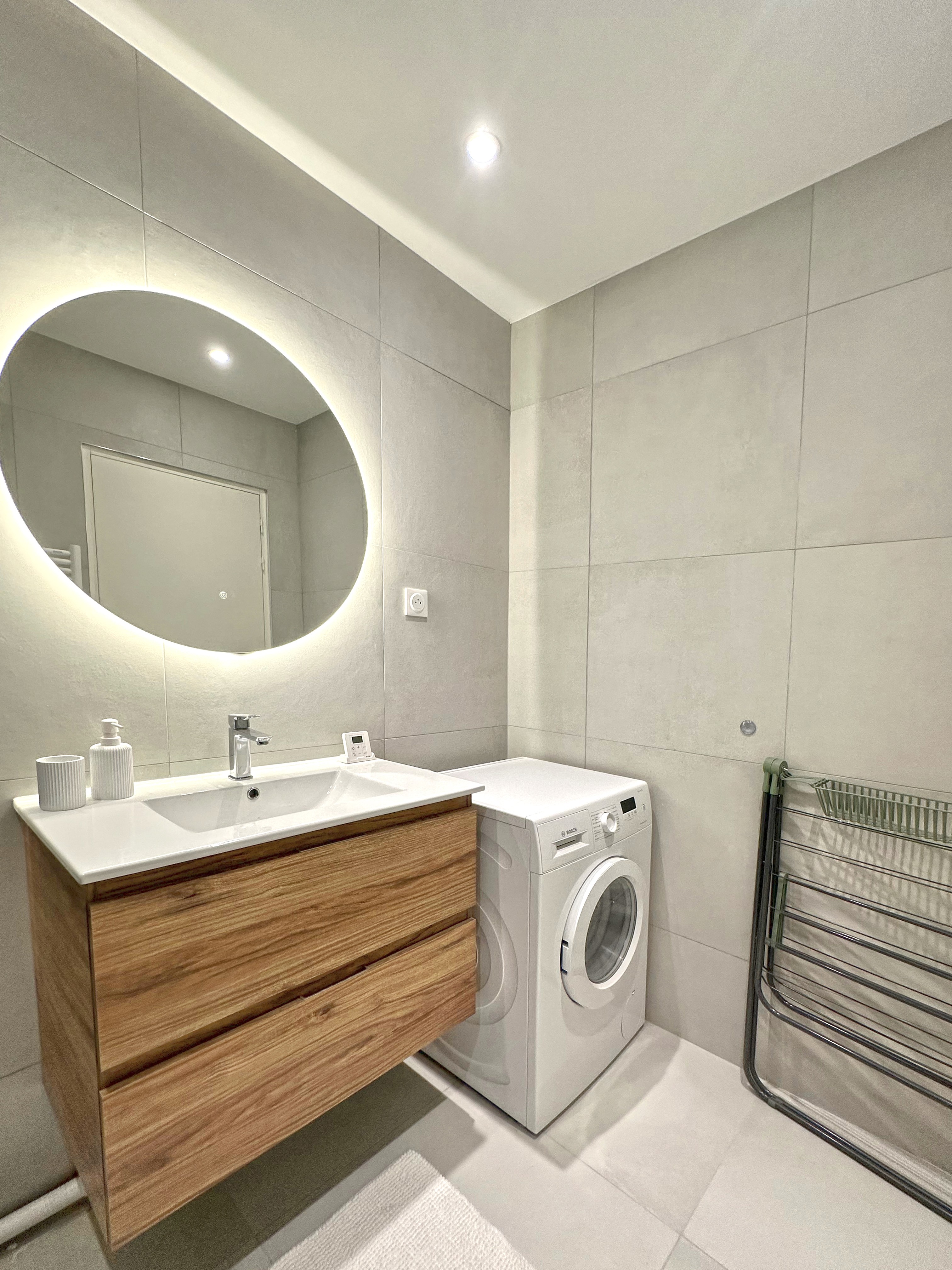🚿 Salle de bain avec une douche, un lavabo et une machine à laver.